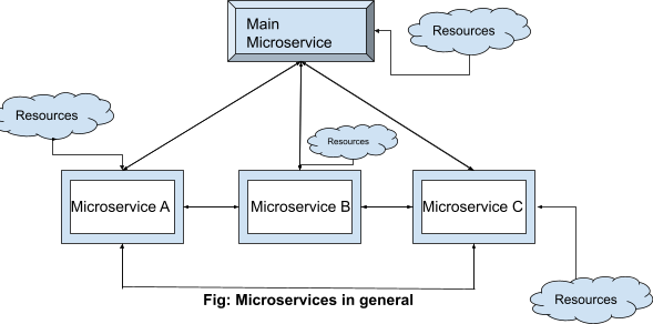In a microservice architecture, all application tiers are loosely coupled and each tier is working as a separate service, called microservice. It is deployed separately with its own resources like memory, CPU, repository, DB, etc. Each microservice is independent of other microservices and thus may be developed using any programming language. These microservices are not dependent on each other and perform their specific functionality on their own but communicate with each other to complete application functionality as a whole. Each microservice may also have a different set of resources, for example, one microservice has its own db while other don’t or it is also possible that all microservices have their own db, or its also possible that all microservices is communicating with another microservice that is responsible for the database related stuff. It all depends on the requirement. So the architecture and resource requirement of microservices is not very straightforward and depends on the requirements. So in the following figure, it is cleared that each microservice may communicate with another microservice depending upon the requirements and implementation of microservice