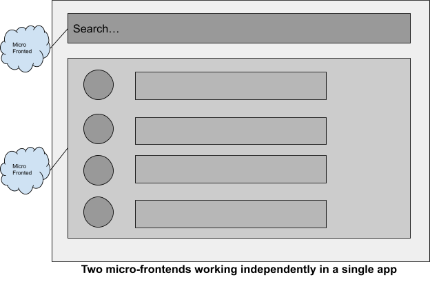 Considering microservice architecture, for frontend applications (micro-frontends), there are different smaller services for each different functionality. Each functionality is being served by an independent micro-frontend. For example, search is implemented in a separate micro-frontend, and listing is managed by another micro-frontend. Both micro-frontends are working as a separate independent service as shown in the below figure.